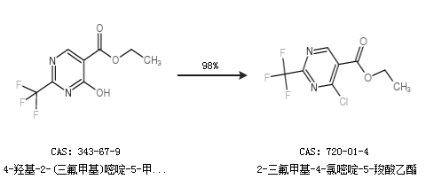 1.通過4-羥基-2-(三氟甲基)嘧啶-5-甲酸乙酯合成2-三氟甲基-4-氯嘧啶-5-羧酸乙酯,收率約98%;