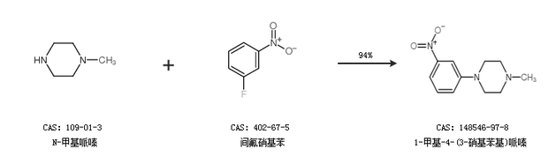 1.通過(guò)N-甲基哌嗪和間氟硝基苯合成1-甲基-4-(3-硝基苯基)哌嗪,收率約94%;