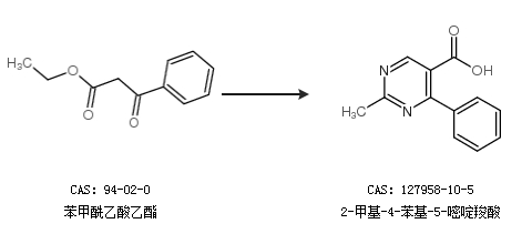 2.通過(guò)苯甲酰乙酸乙酯合成2-甲基-4-苯基-5-嘧啶羧酸