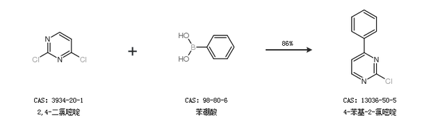 1.通過(guò)2,4-二氯嘧啶和苯硼酸合成4-苯基-2-氯嘧啶,收率約86%;