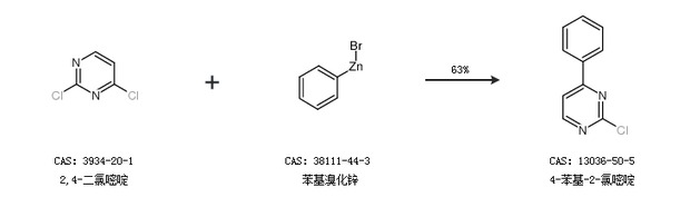 2.通過(guò)2,4-二氯嘧啶和苯基溴化鋅合成4-苯基-2-氯嘧啶,收率約63%;
