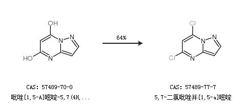 1.通過吡唑[1,5-A]嘧啶-5,7(4H,6H)-二酮合成5,7-二氯吡唑并[1,5-a]嘧啶,收率約64%;