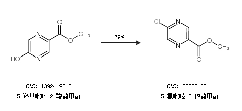1.通過(guò)5-羥基吡嗪-2-羧酸甲酯合成5-氯吡嗪-2-羧酸甲酯,收率約79%;
