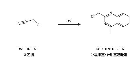 1.通過氯乙腈合成2-氯甲基-4-甲基喹唑啉,收率約74%;