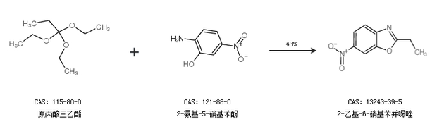 1.通過原丙酸三乙酯和2-氨基-5-硝基苯酚合成2-乙基-6-硝基苯并噁唑,收率約43%;