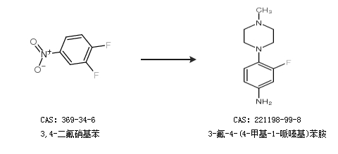 1.通過1-(2-氟-4-硝基苯基)-4-甲基哌嗪合成3-氟-4-(4-甲基-1-哌嗪基)苯胺,收率約92%;