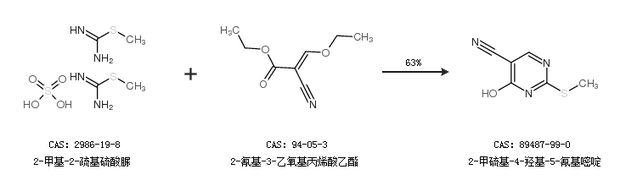 1.通過(guò)2-甲基-2-疏基硫酸脲和2-氰基-3-乙氧基丙烯酸乙酯合成2-甲硫基-4-羥基-5-氰基嘧啶,收率約63%;
