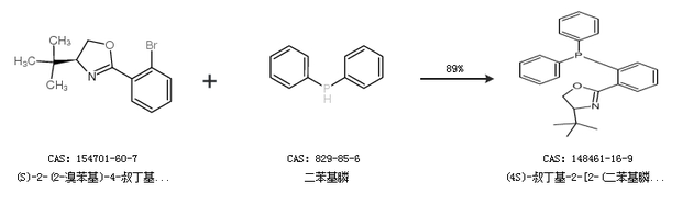 1.通過(S)-2-(2-溴苯基)-4-叔丁基-4,5-二氫噁唑和二苯基膦合成(4S)-叔丁基-2-[2-(二苯基膦基)苯基]-4,5-二氫噁唑,收率約89%;