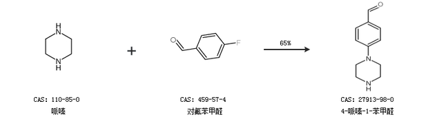 1.通過(guò)哌嗪和對(duì)氟苯甲醛合成4-哌嗪-1-苯甲醛,收率約65%;