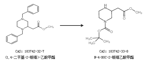 2.通過(1,4-二芐基-2-哌嗪)-乙酸甲酯合成N-4-BOC-2-哌嗪乙酸甲酯