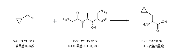 2.通過(guò)(碘甲基)環(huán)丙烷和(+)-2-氨基-N-[(1S,2S)-(2-羥基-1-甲基-2-苯基)乙基]-N-甲基乙酰胺合成D-環(huán)丙基丙氨酸
