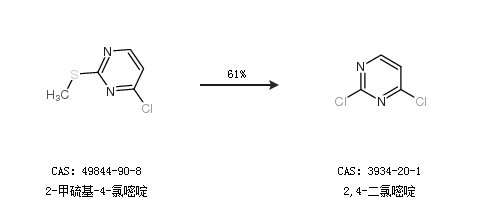 2.通過(guò)2-甲硫基-4-氯嘧啶合成2,4-二氯嘧啶,收率約61%;