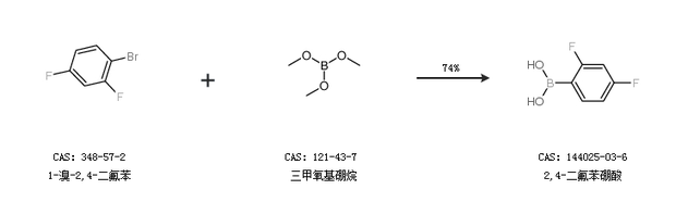 2.通過(guò)1-溴-2,4-二氟苯和三甲氧基硼烷合成2,4-二氟苯硼酸,收率約74%;