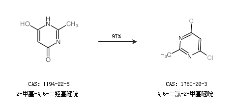 1.通過2-甲基-4,6-二羥基嘧啶合成4,6-二氯-2-甲基嘧啶,收率約97%;