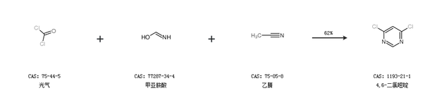 2.通過光氣、甲亞胺酸和乙腈合成4,6-二氯嘧啶,收率約62%;