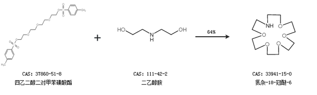 1.通過四乙二醇二對甲苯磺酸酯和二乙醇胺合成氮雜-18-冠醚-6,收率約64%;
