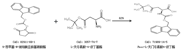 1.通過9-芴甲基-N-琥珀酰亞胺基碳酸酯和L-天冬氨酸-4-叔丁基酯合成Fmoc-L-天門冬氨酸4-叔丁酯,收率約62%;