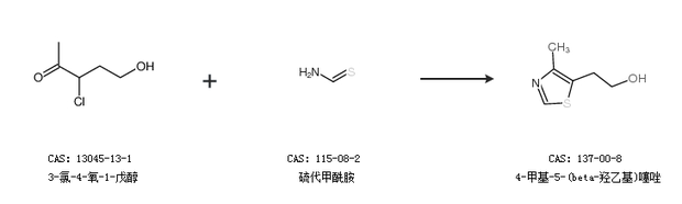 1.通過3-氯-4-氧-1-戊醇和硫代甲酰胺合成4-甲基-5-(beta-羥乙基)噻唑