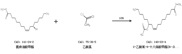 1.通過(guò)蓖麻油酸甲酯和乙酰氯合成2-乙酰氧-9-十八烯酸甲酯[R-(Z)-,收率約10%;