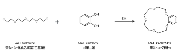 1.通過(guò)雙[2-(2-氯化乙氧基)乙基]醚和鄰苯二酚合成苯并-15-冠醚-5,收率約63%;
