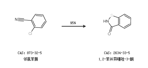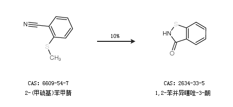 2.通過2-(甲硫基)苯甲腈合成1,2-苯并異噻唑-3-酮,收率約10%;