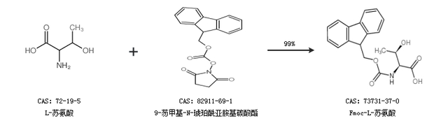1.通過(guò)L-蘇氨酸和9-芴甲基-N-琥珀酰亞胺基碳酸酯合成Fmoc-L-蘇氨酸,收率約99%;