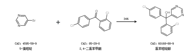2.通過(guò)5-溴嘧啶和2,4-二氯苯甲酮合成氯苯嘧啶醇,收率約34%;