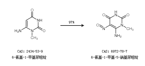 1.通過(guò)6-氨基-1-甲基尿嘧啶合成6-氨基-1-甲基-5-硝基尿嘧啶,收率約97%;