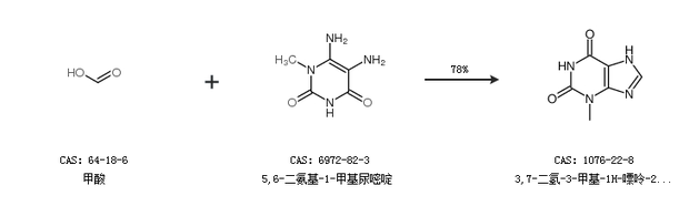 1.通過甲酸和5,6-二氨基-1-甲基尿嘧啶合成3,7-二氫-3-甲基-1H-嘌呤-2,6-二酮,收率約78%;