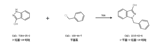 1.通過3-羥基-1H-吲唑和芐基氯合成1-芐基-3-羥基-1H-吲唑,收率約76%;