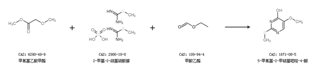 1.通過(guò)甲氧基乙酸甲酯、2-甲基-2-疏基硫酸脲和甲酸乙酯合成5-甲氧基-2-甲硫基嘧啶-4-醇