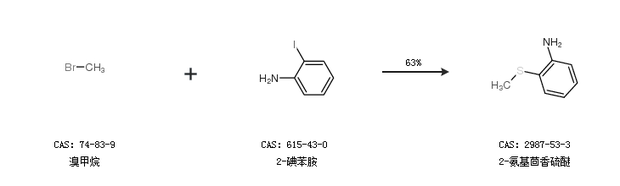1.通過溴甲烷和2-碘苯胺合成2-氨基茴香硫醚,收率約63%;