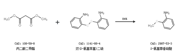 2.通過丙二酸二甲酯和雙(2-氨基苯基)二硫合成2-氨基茴香硫醚,收率約84%;