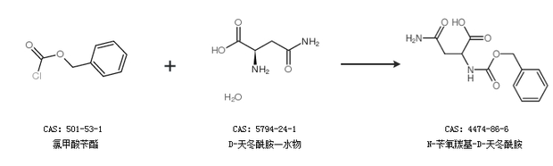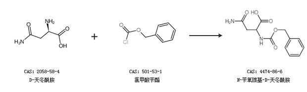 1.通過(guò)D-天冬酰胺和氯甲酸芐酯合成N-芐氧羰基-D-天冬酰胺