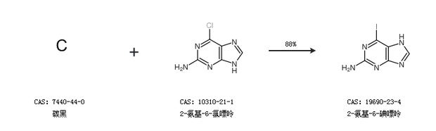 2.通過碳黑和2-氨基-6-氯嘌呤合成2-氨基-6-碘嘌呤,收率約88%;