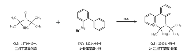 1.通過(guò)二叔丁基氯化膦和2-聯(lián)苯基溴化鎂合成2-(二叔丁基膦)聯(lián)苯,收率約86%;