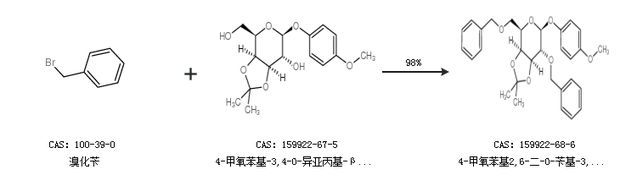 1.通過溴化芐和4-甲氧苯基-3,4-O-異亞丙基-β-D-吡喃半乳糖苷合成4-甲氧苯基2,6-二-O-芐基-3,4-O-異亞丙基-β-D-吡喃半乳糖苷,收率約98%;