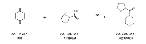 1.通過哌嗪和2-四氫糠酸合成四氫糠酰哌嗪,收率約92%;