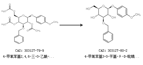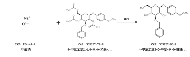 1.通過(guò)甲醇鈉和4-甲氧苯基2,4,6-三-O-乙酰-3-O-芐基-β-D-吡喃葡萄糖苷合成4-甲氧苯基3-O-芐基-β-D-吡喃葡萄糖苷,收率約87%;