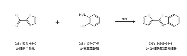 2.通過2-噻吩甲酰氯和2-氨基苯硫醇合成2-(2-噻吩基)苯并噻唑,收率約95%;