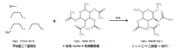 2.通過(guò)甲硫基三丁基錫烷和6-脫氧-ALPHA-D-吡喃葡萄糖 1,2,3,4-四乙酸酯合成2,3,4-三-O-乙酰基-1-硫代-β-L-巖藻糖苷甲酯,收率約54%;