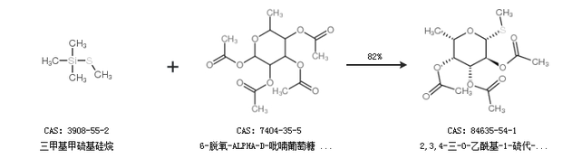 1.通過(guò)三甲基甲硫基硅烷和6-脫氧-ALPHA-D-吡喃葡萄糖 1,2,3,4-四乙酸酯合成2,3,4-三-O-乙酰基-1-硫代-β-L-巖藻糖苷甲酯,收率約82%;