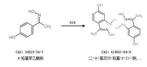 1.通過4-羥基苯乙酮肟合成二-μ-氯雙[5-羥基-2-[1-(肟基)乙基]苯基]鈀(II)二聚體,收率約91%;