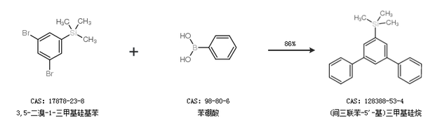 1.通過3,5-二溴-1-三甲基硅基苯和苯硼酸合成(間三聯(lián)苯-5''-基)三甲基硅烷,收率約86%;