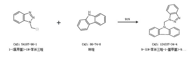 1.通過(guò)1-(氯甲基)-1H-苯并三唑和咔唑合成9-(1H-苯并三唑-1-基甲基)-9H-咔唑,收率約91%;