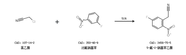 1.通過氯乙腈和對氟硝基苯合成5-氟-2-硝基苯乙腈,收率約51%;