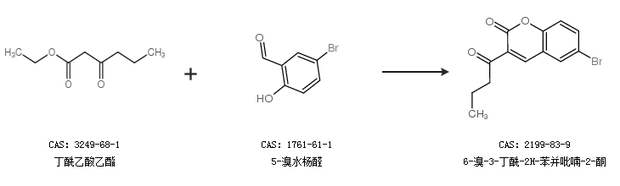 1.通過丁酰乙酸乙酯和5-溴水楊醛合成6-溴-3-丁酰-2H-苯并吡喃-2-酮