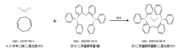 1.通過(1,5-環(huán)辛二烯)二氯化鈀(II)和雙(2-二苯基磷苯基)醚合成雙(二苯基膦苯基醚)二氯化鈀(II),收率約82%;